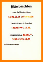Zu den BÜROZEITEN im TAFELLADEN, jeweils am MITTWOCH zwischen 10 - 12 Uhr, ist die Ausfertigung von Einkaufsberechtigungen möglich.